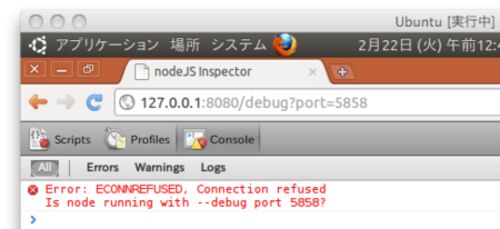 以下のエントリを参考にして、node-inspectorでnode.jsでのデバッグを実行してみようとしたのですが、接続が拒否されてしまいました。 node.jsでのデバッグ方法 - すにぺっと Error: ECONNREFUSED, Connection refused Is node running with --debug port 58…